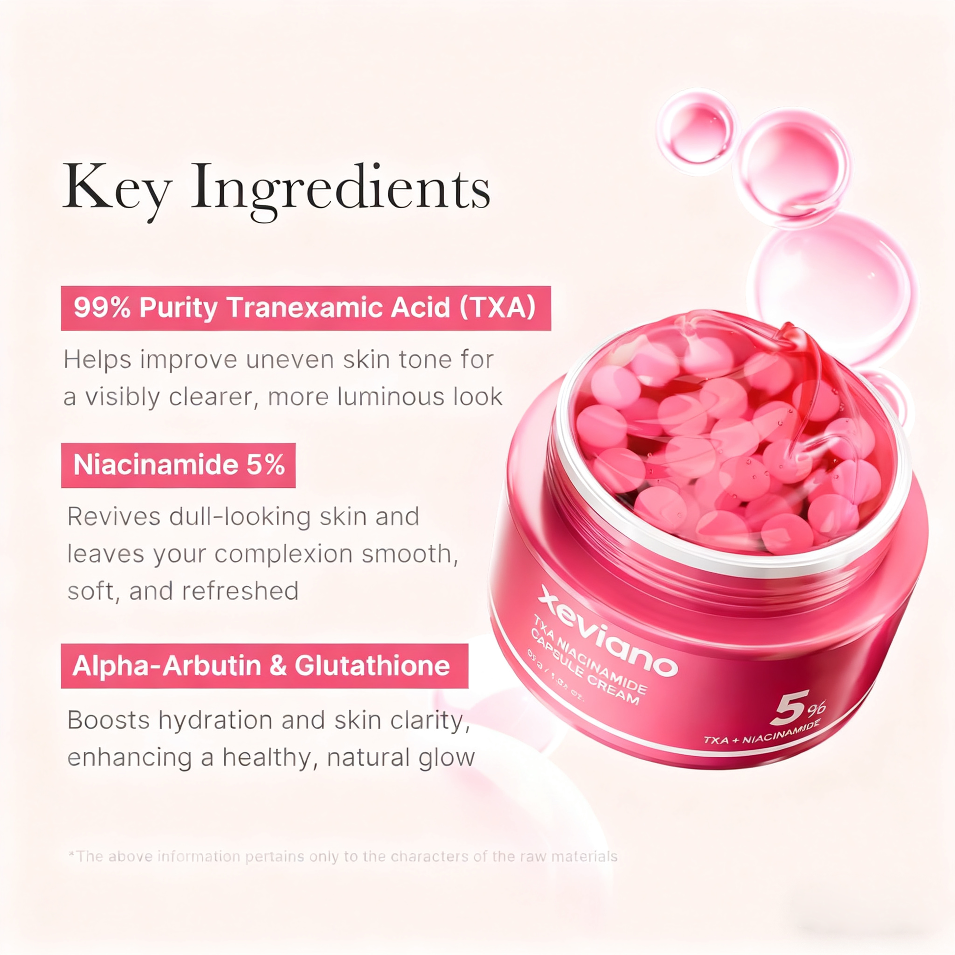 [99% Purity Tranexamic Acid (TXA) + 5% Niacinamide] High-Potency Formula for Clear and Radiant Skin - Formulated with a highly condensed concentration of TXA to help improve uneven skin tone and enhance clarity, leaving your complexion smooth, radiant, and refreshed. *The above information pertains only to the characters of the raw materials / Results may vary depending on individual skin types.